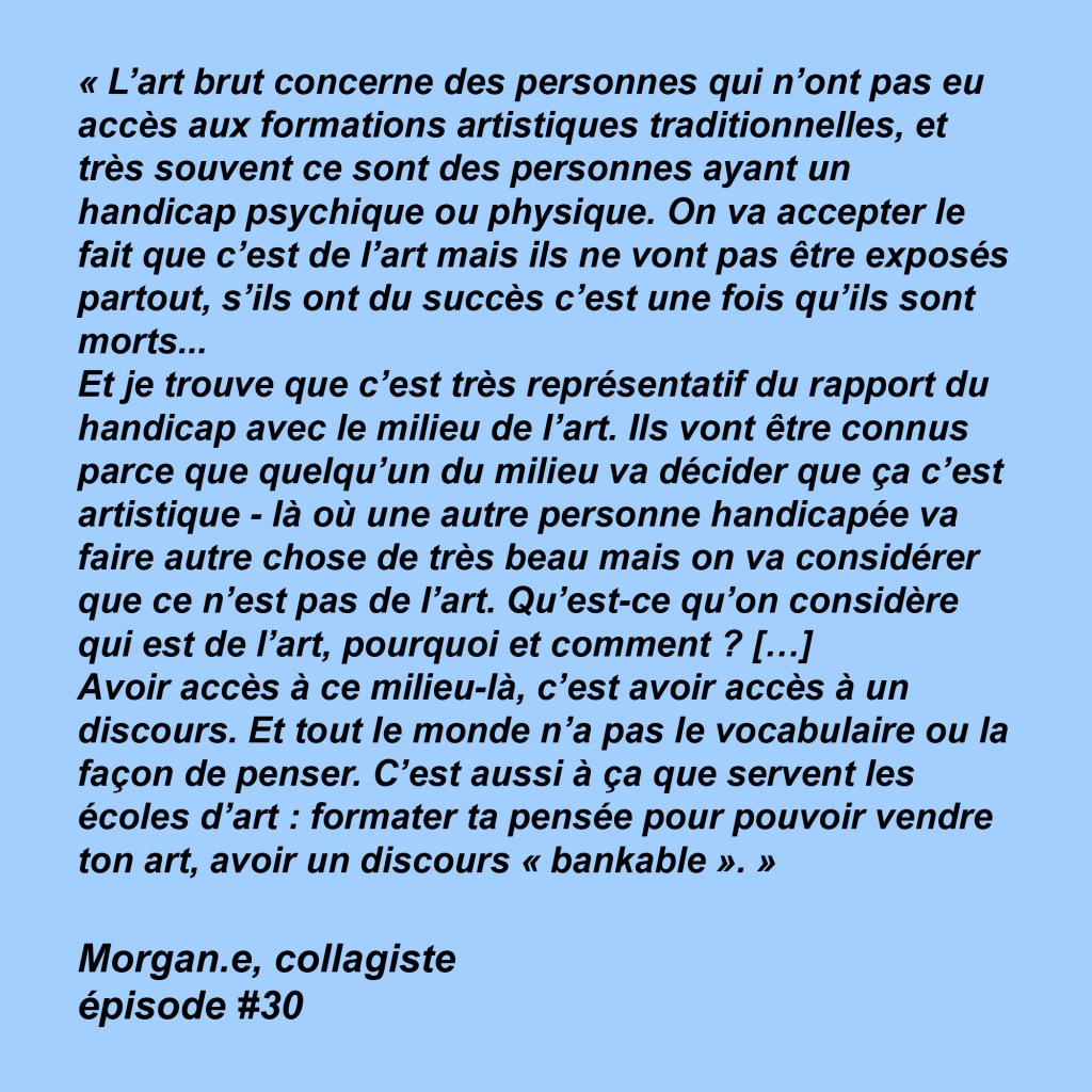 Elle m’a raconté la façon dont elle a vécu ses études, sa tendance à mixer différents médiums, résultant en une oeuvre hybride et inclassable. Nous avons évoqué le sexisme qu’elle a pu vivre et constater au sein de l’école – un sexisme qui s’est poursuivi dans le monde professionnel par la suite.