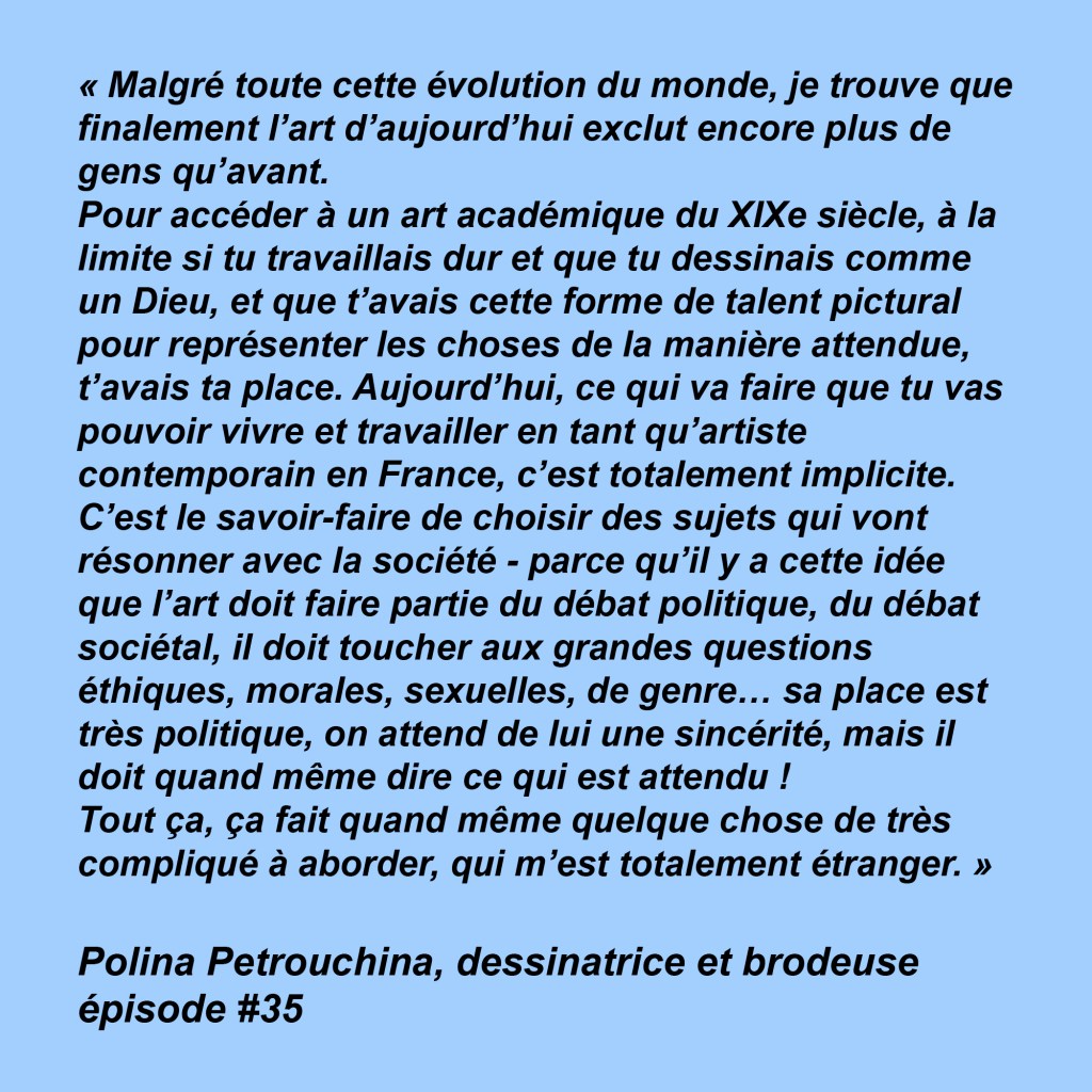 Pour ce trente-cinquième épisode, mon invitée est Polina Petrouchina, brodeuse et dessinatrice. Née en Russie dans une famille de peintres, elle est arrivée en France à l’âge de sept ans et a baigné dans un environnement où l’art faisait partie du quotidien. Nous avons parlé de ses difficultés à se sentir légitime en tant qu’artiste et des différences qu’elle a constatées entre les approches créatives russes et françaises.