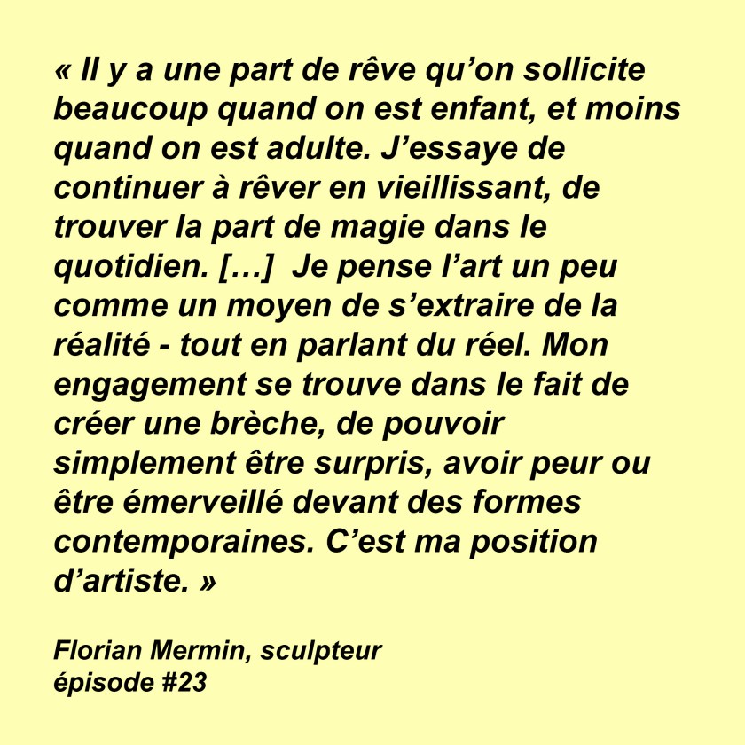 Pour ce vingt-troisième épisode, mon invité est Florian Mermin, sculpteur. Florian a commencé à s’intéresser à l’art au lycée, et a pu accéder à des informations sur les Ecoles Supérieures d’Art lors d’un stage pour les élèves issu-e-s des zones d’éducation prioritaires. Il a alors intégré les Beaux-Arts de Paris, et durant ses études, il a pu faire un échange à Los Angeles, à Otis College of Art and Design, où il a commencé à faire de la céramique et a eu un autre aperçu de l’enseignement artistique. Diplômé félicité en 2015, la sortie d’école a fait naitre des projets d’expositions professionnelles enrichissantes. Nous avons discuté de son rapport à l’espace d’exposition et aux contraintes de ce qu’on appelle le « white cube », ces pièces immaculées et impersonnelles qu’on retrouve fréquemment dans les musées et les galeries. Enfant, il s’intéressait beaucoup à la nature et aux fleurs, et cela se retranscrit dans son travail artistique aujourd’hui, qui intègre des éléments tels que des fleurs séchées, des branches de sapin, ou encore de la terre… Dans ses installations, Florian détourne cet espace en créant une atmosphère où il invite la nature, les odeurs, les couleurs. Nous avons également parlé de son rapport à l’écologie et de sa vision de l’engagement politique dans le travail artistique, qu’il préfère exprimer dans une poésie du quotidien.