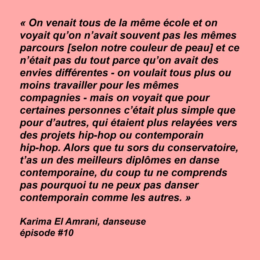 Pour ce dixième épisode, mon invitée est Karima El Amrani. Karima est danseuse. Elle a entre autre travaillé à Londres pour la compagnie Hofesh Shechter et le Clod Ensemble, à Berlin avec Christoph Winkler, à Genève avec la Compagnie 7273, et en France avec Damien Jalet et le Centre Chorégraphique National de Tours. Ensemble, nous avons parlé de sa passion pour la danse survenue dans l’enfance, de ses études enrichissantes au Conservatoire National Supérieur de Musique et de Danse de Paris, et de la vision qu’elle en a aujourd’hui avec le recul. Elle m’a parlé de la tendance que peuvent avoir certains professionnels du milieu à assigner les danseur-euses non blanc-hes à certains types de danses comme le hip-hop, et des difficultés qui parfois en découlent pour trouver un travail en danse contemporaine. Elle m’a raconté comment elle a vécu sa grossesse, et m’a expliqué comment fonctionnait le congé maternité pour les intermittentes du spectacle. Nous avons aussi parlé de ses premiers pas en tant que chorégraphe avec son projet de solo, appelé « Album de Chorégraphies ».