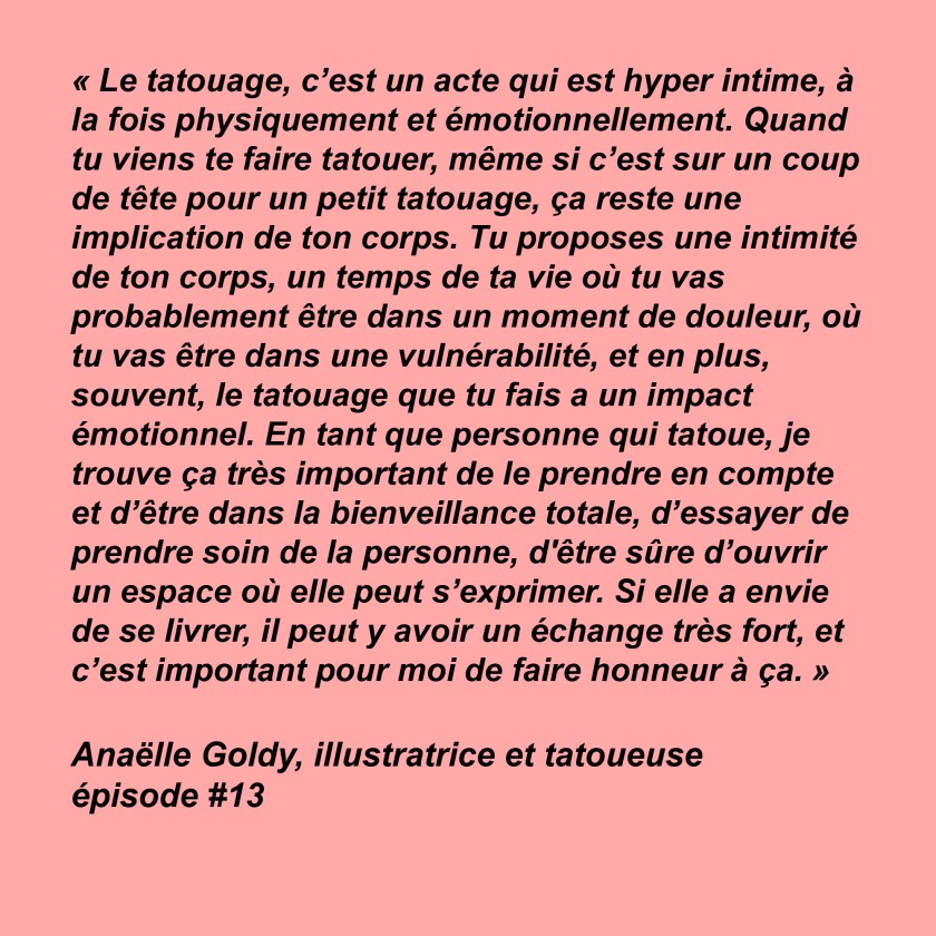 Pour ce treizième épisode, mon invitée est Anaëlle Goldy, dessinatrice et tatoueuse. Anaëlle m’a parlé de sa pratique du dessin qui lui est restée depuis l’enfance, encouragée par une ambiance familiale propice. Après avoir eu du mal à trouver sa voie durant ses études d’art, elle a pris le chemin de la médiation culturelle et a commencé à travailler dans ce domaine, avant de se rendre compte qu’une vie rythmée par un emploi salarié traditionnel ne lui convenait pas. Elle m’a raconté son besoin d’indépendance qui s’est traduit par un changement vers une voie plus libre d’illustratrice et de tatoueuse. Nous avons parlé de son rapport à son inspiration artistique, de son amour pour la pratique du tatouage, et de ses convictions féministes et militantes. Elle m’a également confié les nombreux projets créatifs qu’elle a sur le feu. J’espère que cet épisode vous plaira. Bonne écoute !
