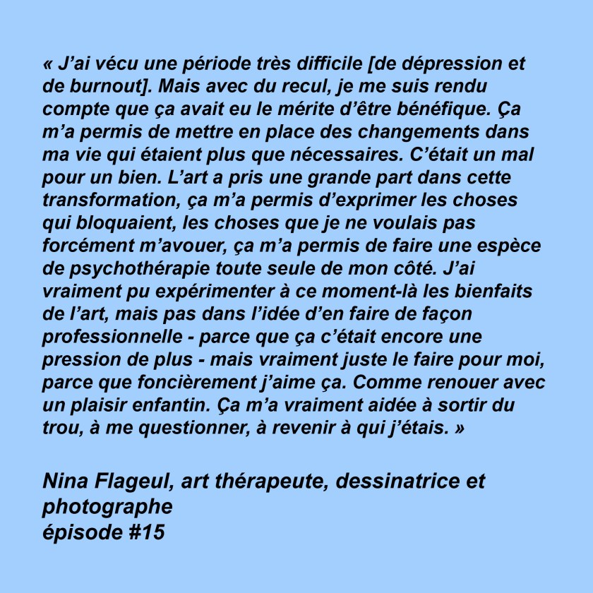 Pour ce quinzième épisode, mon invitée est Nina Flageul, dessinatrice et art thérapeute. Elle m’a raconté comment son intérêt pour l’art moderne est né par hasard quand elle était petite, au hasard des pages d’un dictionnaire, et l’a menée à s’inscrire à la Sorbonne pour étudier l’Histoire de l’Art à Paris, tout en pratiquant le dessin et la photographie. Mais au bout de deux ans d’études, un burnout l’a poussée à faire une pause, et c’est à ce moment-là qu’elle s’est rendu compte de la valeur qu’avait l’art dans sa reconstruction personnelle. En résonance avec ce parcours, elle a décidé de se lancer dans des études de psychologie afin de devenir art thérapeute. Nous avons aussi discuté de son activité de modèle pour les photographes et les peintres, et de la manière dont cela l’a aidée à voir son corps autrement. Elle m’a parlé de son implication dans le mouvement Body Positive, de sa prise de conscience féministe, et de son activité d’illustratrice – un métier qu’elle aimerait continuer de faire à côté de l’art thérapie.