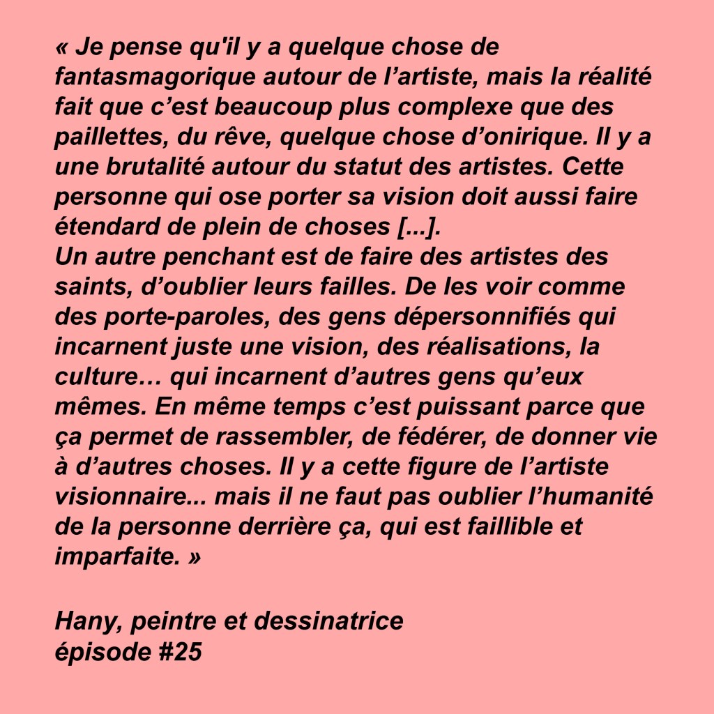 Pour ce vingt-cinquième épisode, mon invitée est Hany, peintre et dessinatrice. Ayant grandi dans un environnement où l’art faisait partie de son quotidien, entre musique et peinture, il lui a semblé naturel de s’exprimer par le dessin. Au moment de choisir son parcours d’études, elle a hésité à tenter une école de Beaux-Arts mais a finalement choisi de se diriger vers une licence en arts du spectacle. Elle a alors quitté sa Réunion natale pour aller étudier à Paris VIII. Cela lui a permis de travailler avec des compagnies de théâtre en tant que médiatrice culturelle, chargée de diffusion ou encore chargée de production. Mais petit à petit, elle s’est rendu compte que cette immersion dans les arts de la scène l’avait peu à peu déplacée de sa pratique du dessin. Elle s’est alors remise à dessiner et à peindre, toujours en autodidacte. Nous avons parlé de son inspiration et des techniques qu’elle utilise, mais aussi de l’enjeu politique de représenter des corps gros, assignés femme et racisés dans un monde saturé d’images de personnes blanches et minces.