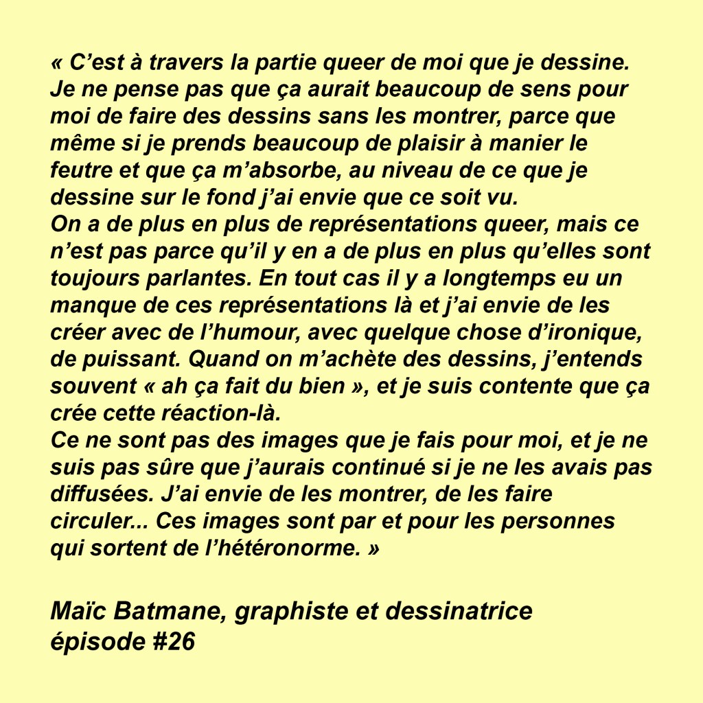 Pour ce vingt-sixième épisode, mon invitée est Maïc Batmane, graphiste et dessinatrice. Son intérêt pour le dessin s’est développé dans l’enfance. Elle a pu étayer cette pratique dans les Ateliers de dessins de sa ville, qui l’ont accompagnée jusqu’à la fin de l’adolescence. Après le lycée, elle a fait deux années de classe préparatoire aux Ecoles d’Art avant d’intégrer l’Ecole des Arts Décoratifs de Paris. Ses années d’études ont été mouvementées, notamment en raison de son intérêt grandissant pour le féminisme et le militantisme queer, qui était peu compris de son entourage scolaire et familial. Après une courte errance de sortie d’école, elle a eu un premier poste de graphiste salariée, mais le manque de créativité et de diversité des projets ne lui convenait pas. Elle s’est alors lancée en freelance, travaillant pour des associations. Mais au fil des mois, elle s’est rendu compte que sa pratique créative personnelle, qu’elle avait abandonnée durant ses études très prenantes, lui manquait. Elle s’est alors remise à créer, d’abord à travers le collage puis par la sérigraphie, un médium dans lequel elle s’est pleinement épanouie. Nous avons parlé de son inspiration et de son envie de partager ses oeuvres, stimulée par le désir de partager des images fortes avec d’autres personnes queer qui puissent s’y reconnaître. Elle m’a expliqué le lien entre son histoire familiale et la présence forte d’imagerie religieuse dans ses dessins. Nous avons également discuté de son travail de graphiste, qui lui plaît beaucoup, et de son avis ambivalent sur la précarité du statut de l’artiste dans notre société.