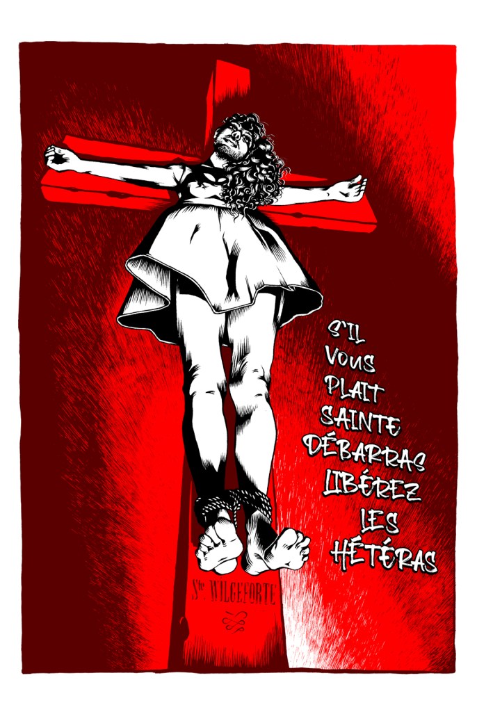 En bonus, Maïc vous raconte l’histoire de la Sainte Wilgeforte : « Wilgeforte est une sainte légendaire de la tradition catholique, également invoquée dans le nord de la France sous le nom de « Sainte Débarras ». Elle fut une sainte très populaire dans certaines régions d’Europe. Récits et représentations la dépeignent sous les traits d’une vierge barbue et crucifiée, alors que la crucifixion était réservée aux hommes. Sa barbe était le résultat de ses prières pour échapper, selon les différentes légendes, au viol collectif, au mariage forcé ou à l’inceste de son père. Elle était celle que l’on invoquait, entre autres choses, pour se débarrasser d’un époux ou d’un « mariage malheureux ». Son (sur)nom dans les différentes langues : Débarras, Uncumber (« désencombrer »), Librata, Liberada… évoquent tous l’idée de débarras ou de libération. On sait aujourd’hui que son existence est purement légendaire, et il existe différentes suppositions sur les origines du culte de ce « Christ féminin » vers le 14e siècle, vous pouvez en lire plus à la page que je lui consacre : http://www.maicbatmane.fr/sainte-debarras-sainte-wilgeforte Sainte Wilgeforte était fêtée le 20 juillet jusqu’à son retrait du martyrologe romain en 1969, l’Église n’ayant jamais encouragé son culte. Elle est une figure de l’androgynie, du travestissement, et du refus de l’hétérosexualité. »